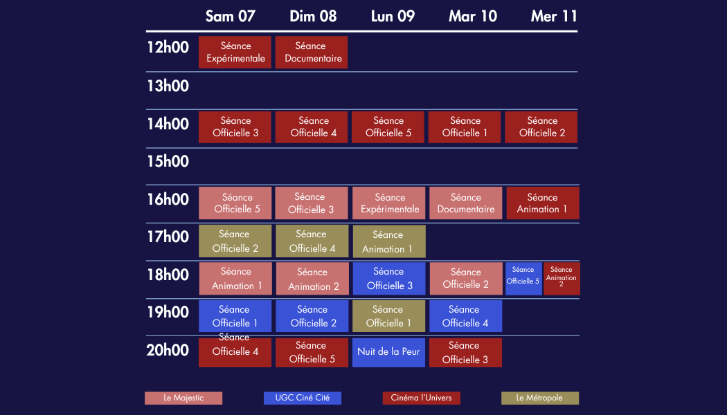 La Compétition Officielle regroupe une vingtaine de courts métrages, répartis en cinq séances de 1h30 environ. Chaque séance possède sa propre identité et s’organise autour d’un thème. Lors de la remise des prix, les films ne sont pas seulement jugés avec les autres films de leur séance, mais bien avec l’ensemble des courts métrages sélectionnés en Compétition Officielle.